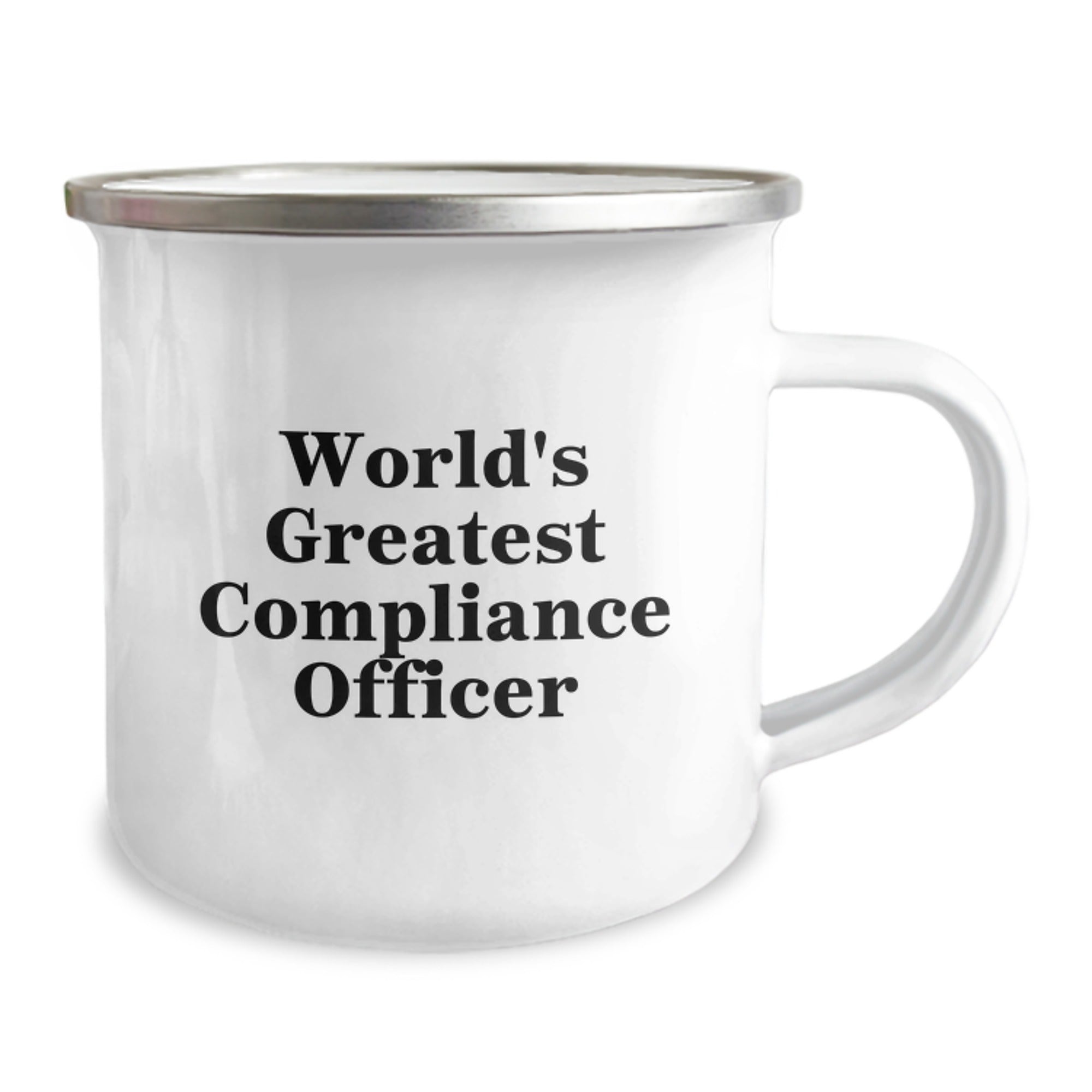 This 'World's Greatest Compliance Officer' 12 oz stainless steel camping mug is the ideal gift for any Compliance Officer who loves to stay outdoors and enjoy nature. Made with a sturdy enamel finish, this camping mug is built to last and can withstand the toughest camping trips.