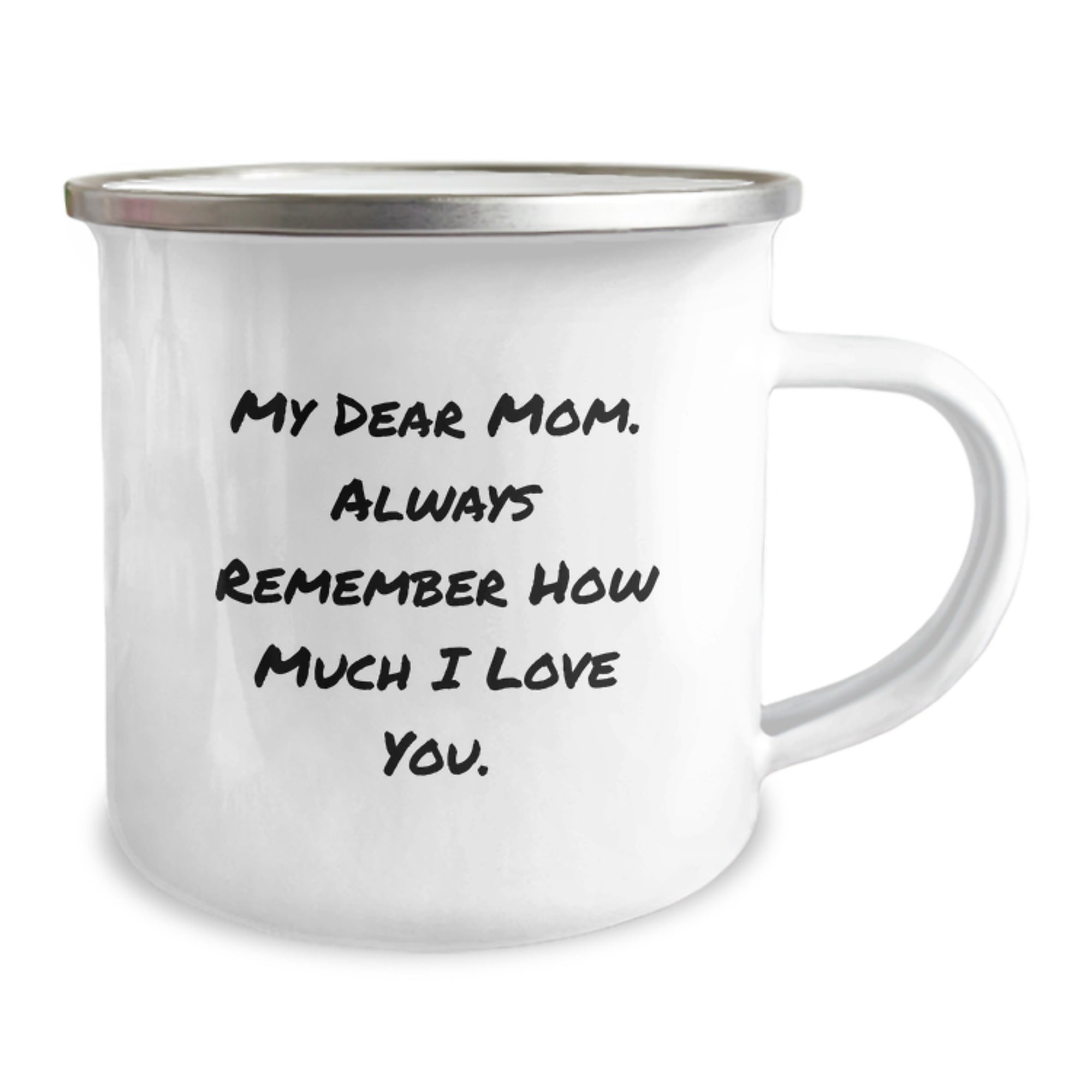 Made of high-quality stainless steel with an enamel finish, this camping mug is sturdy and long-lasting. The quote 'My Dear Mom. Always Remember How Much I Love You.' is a heartwarming message that will remind mom how much she is loved and appreciated.