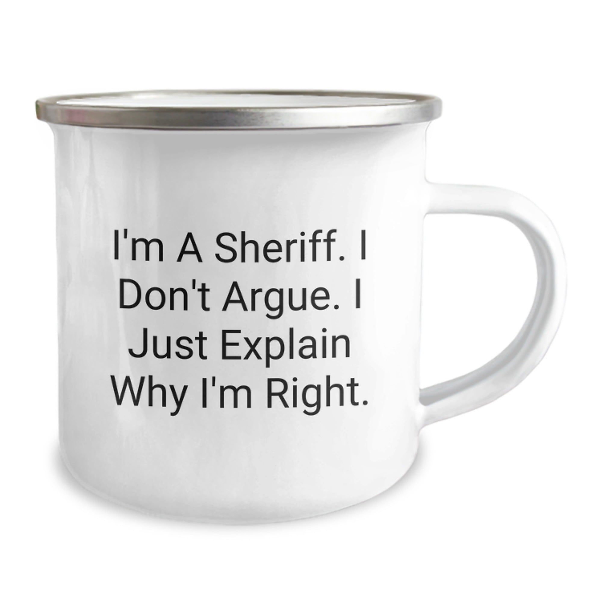 This Sheriff Camping Mug features the iconic quote 'I'm A Sheriff. I Don't Argue. I Just Explain Why I'm Right' in a bold, permanent print that won't fade after washing. Made from sturdy stainless steel with an enamel finish, this 12 oz mug is built to withstand the rigors of the great outdoors.