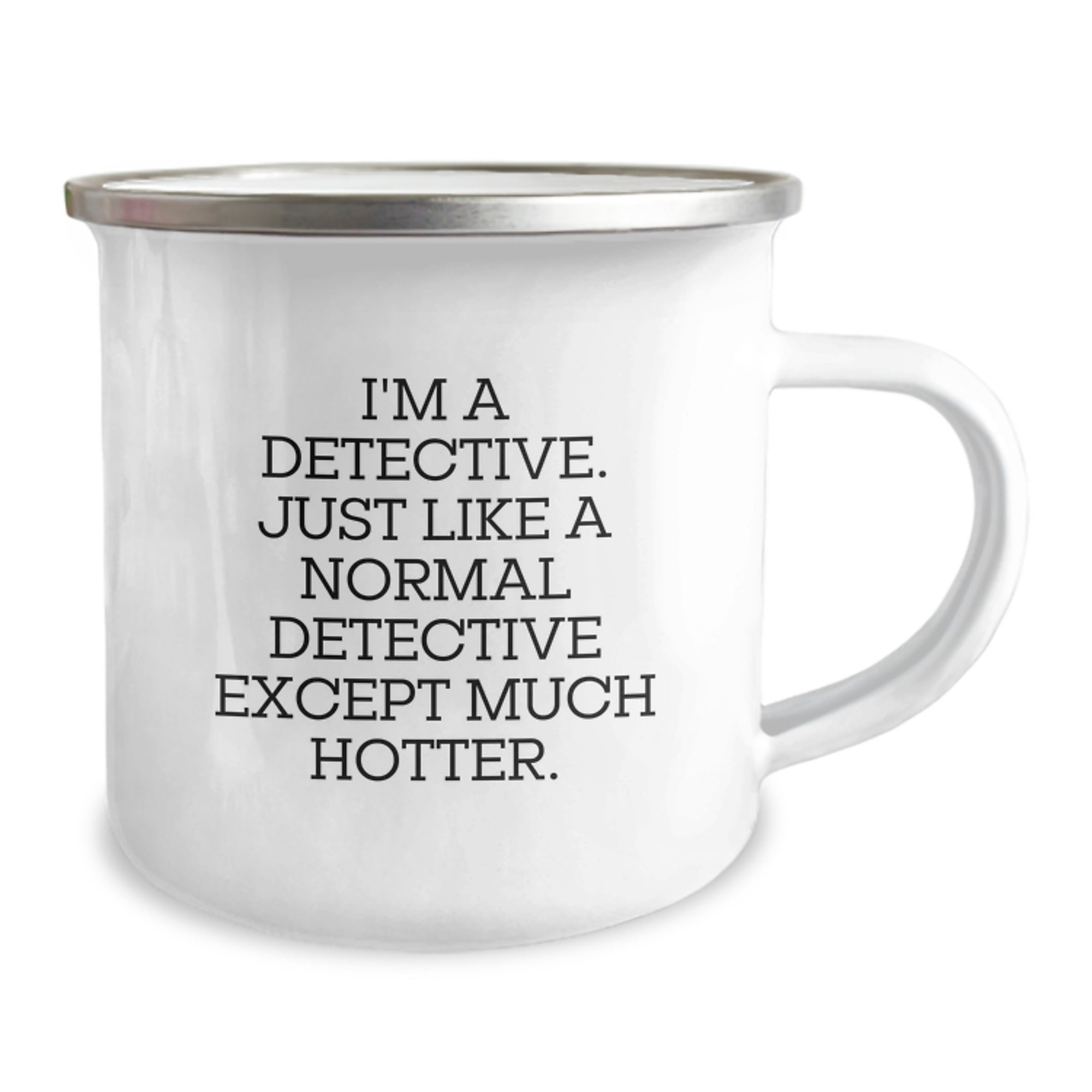 Our camping mug features a quote that's sure to bring a smile to their face: 'I'm A Detective. Just Like A Normal Detective Except Much Hotter.' The mug is a 12 oz stainless steel cup with an enamel finish, making it sturdy and long-lasting.