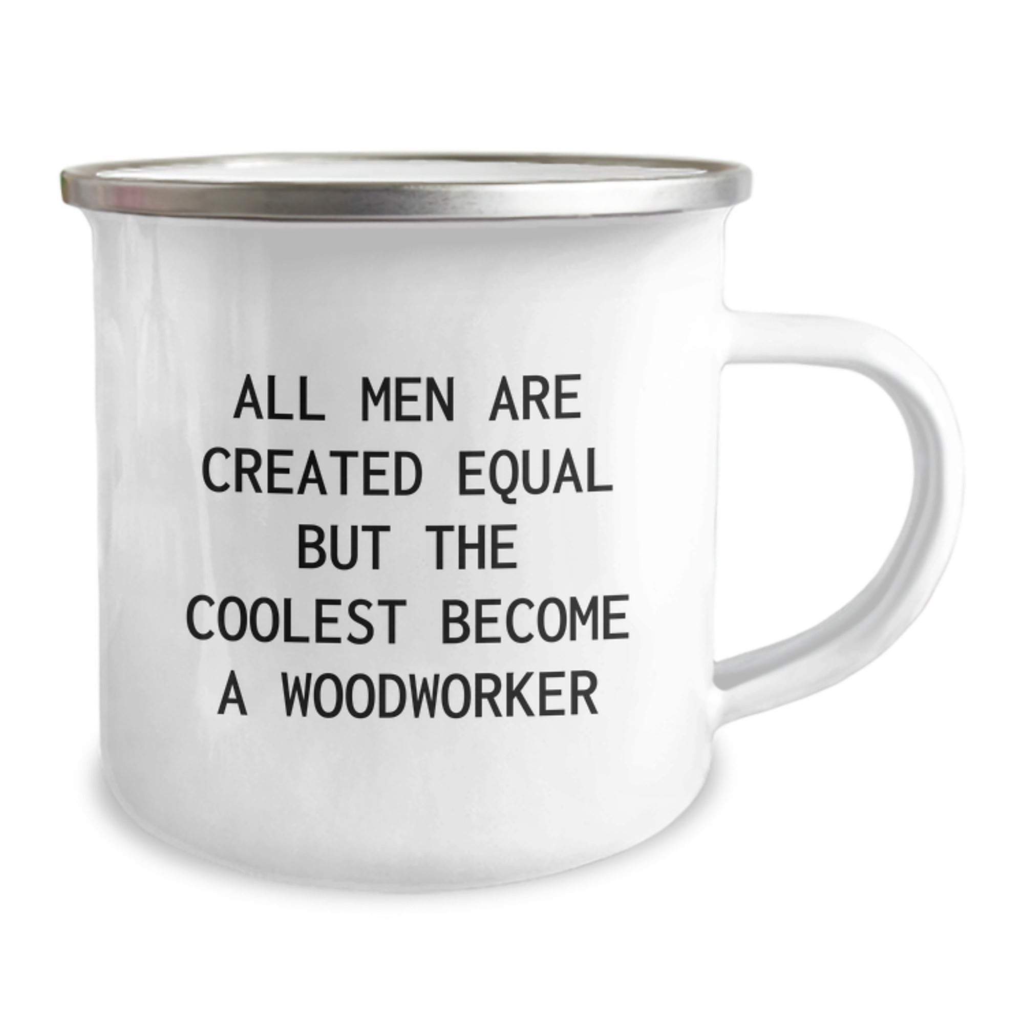 This Woodworker Camping Mug is a thoughtful present that any Woodworker would love to receive. The quote 'All Men Are Created Equal But The Coolest Become A Woodworker' showcases the special bond between Woodworkers and celebrates their passion for woodworking. The sturdy stainless steel construction and enamel finish of this 12 oz capacity mug make it perfect for sipping coffee, tea, or hot chocolate while working on your latest woodworking project.