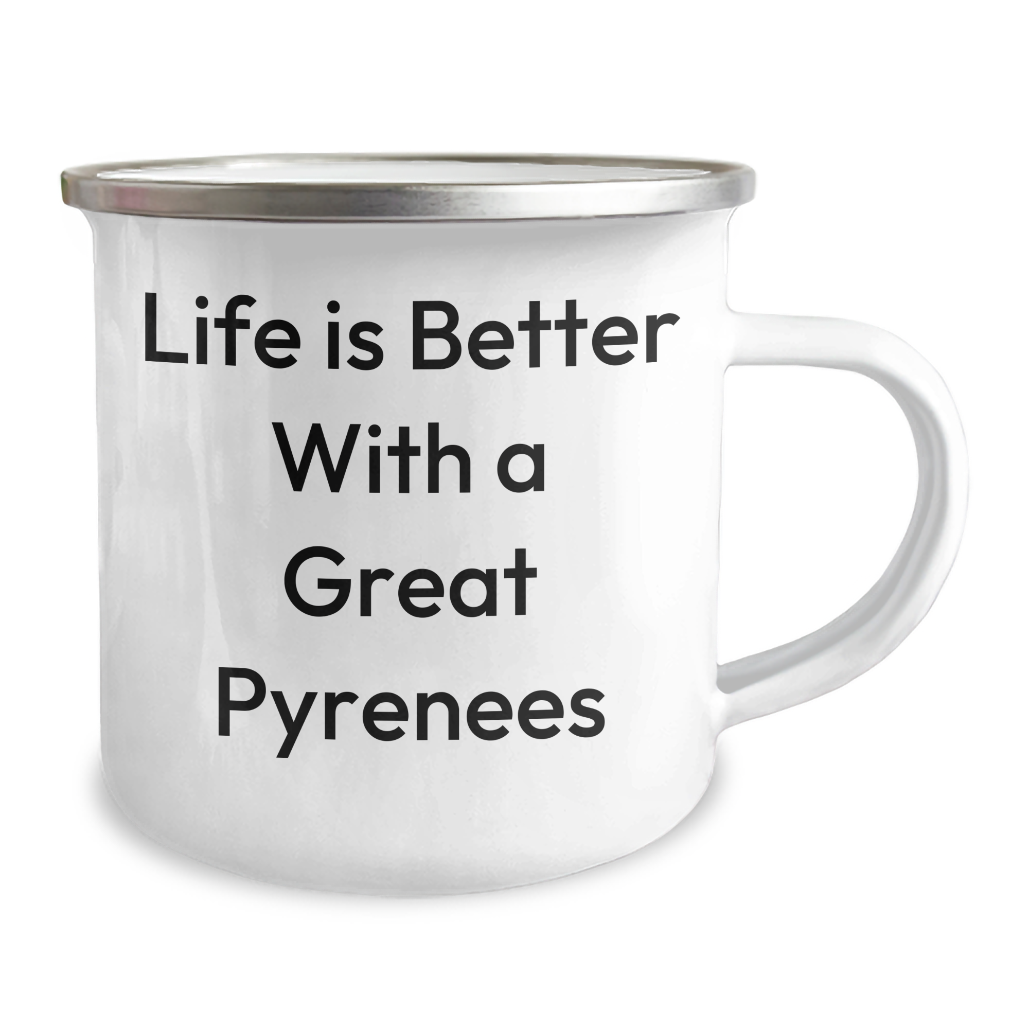 Sip your favorite beverage from this Great Pyrenees Dog Camping Mug. It features the quote 'Life Is Better With A Great Pyrenees'. Whether you're enjoying a hot cup of coffee around the campfire or a cold glass of lemonade after a long hike, this enamel camping mug is perfect for any Great Pyrenees dog lover.