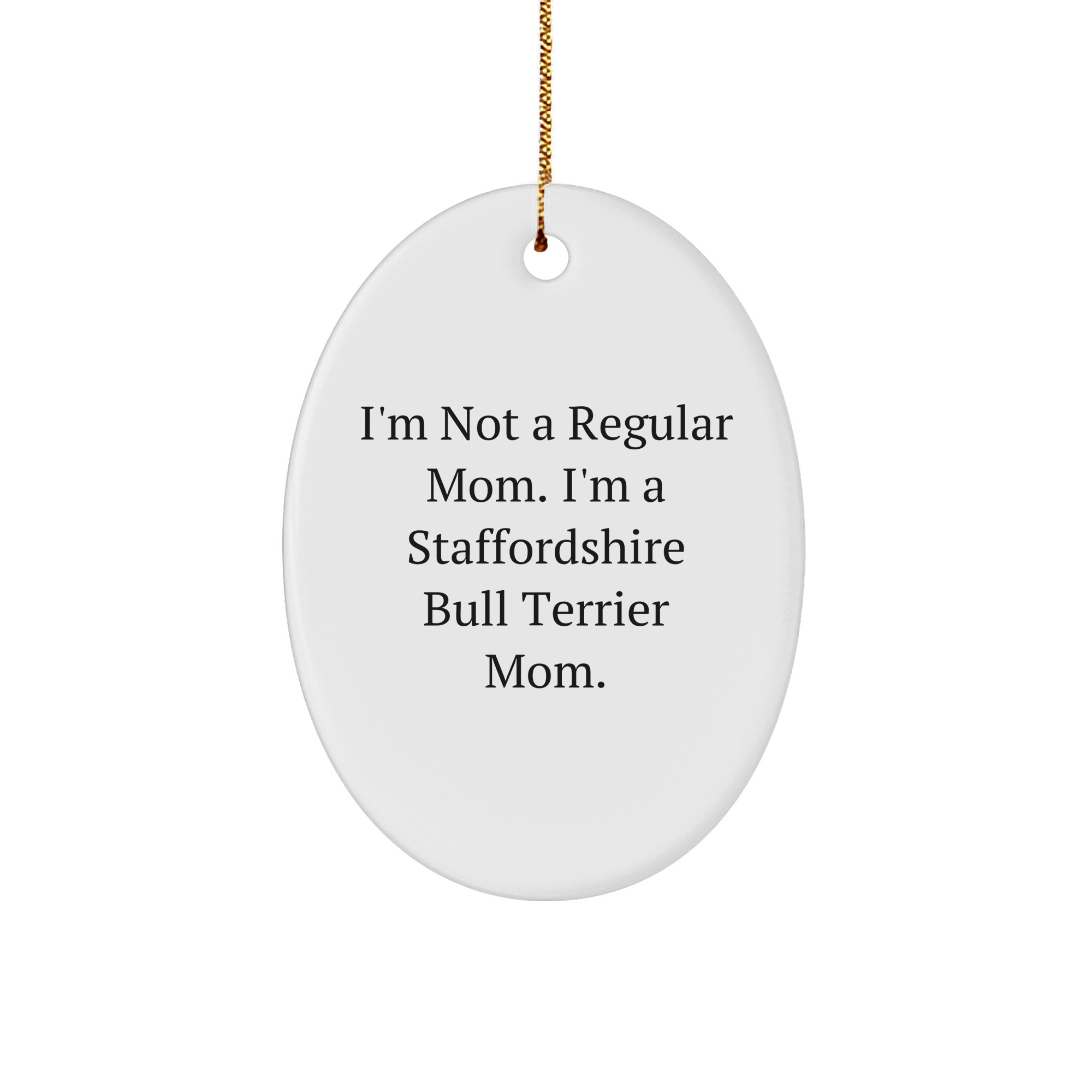 Are you a proud Staffordshire Bull Terrier Dog mom or looking for a unique Christmas gift for someone who loves these adorable dogs? Look no further Our I'm Not A Regular Mom. I'm A Staffordshire Bull Terrier Mom. oval ornament is the perfect way to celebrate Staffordshire Bull Terrier Dog pride. Made from high-quality white sturdy MDF, this 3" oval-shaped ornament is a thoughtful gift for friends, family, or coworkers.