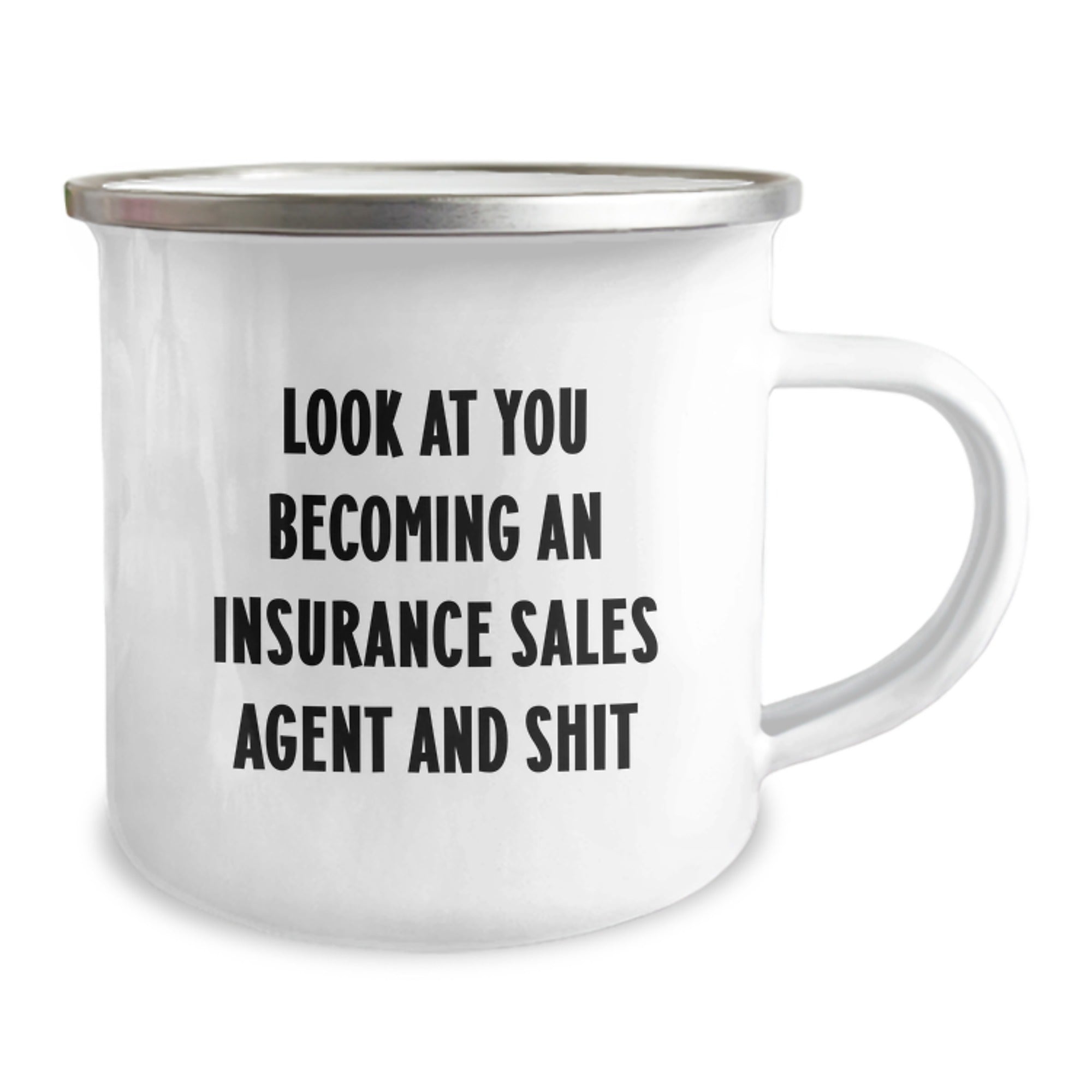 Start your day off right with a funny 'Look At You Becoming An Insurance Sales Agent And Shit' camping mug that's perfect for any insurance sales agent. Made of sturdy stainless steel with an enamel finish, this camping mug is built to last.