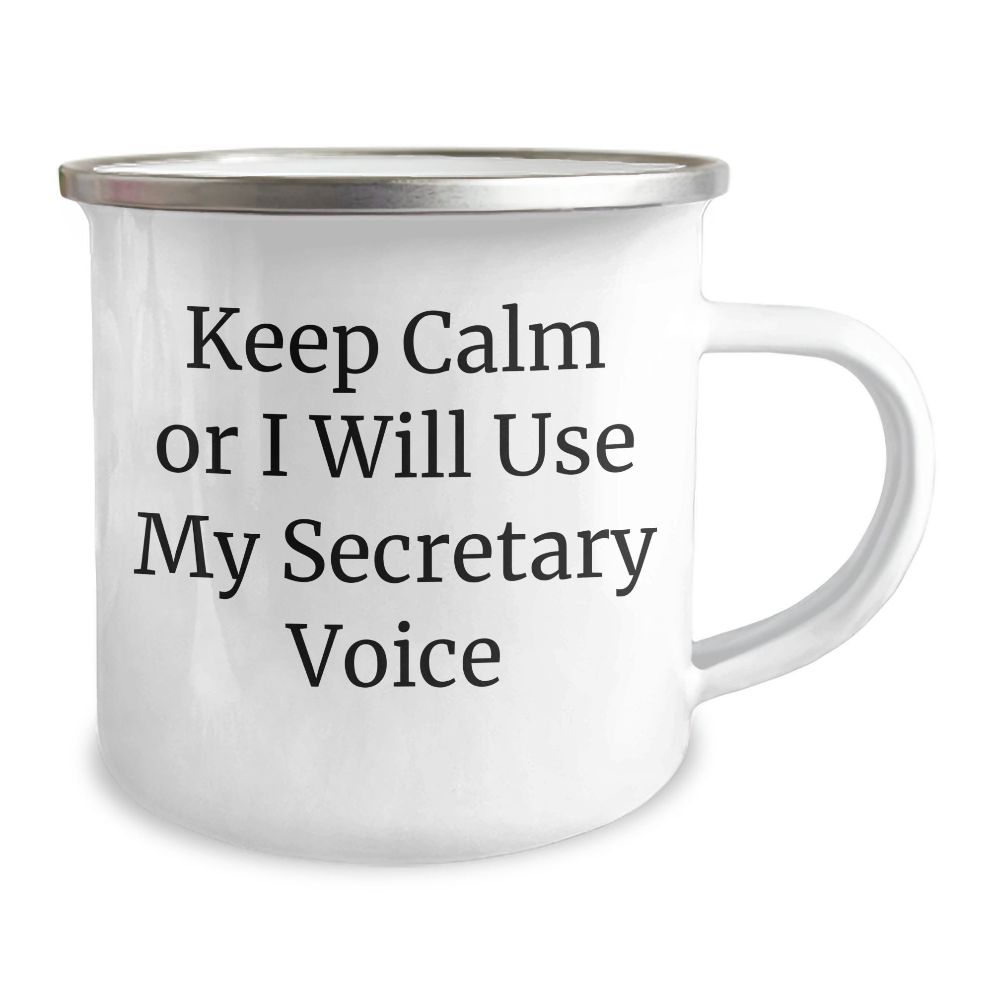 Funny Secretary Gifts, 'Keep Calm Or I Will Use My Secretary Voice' Camping Mug, 12 oz, Hand Wash, Perfect for Mother's Day