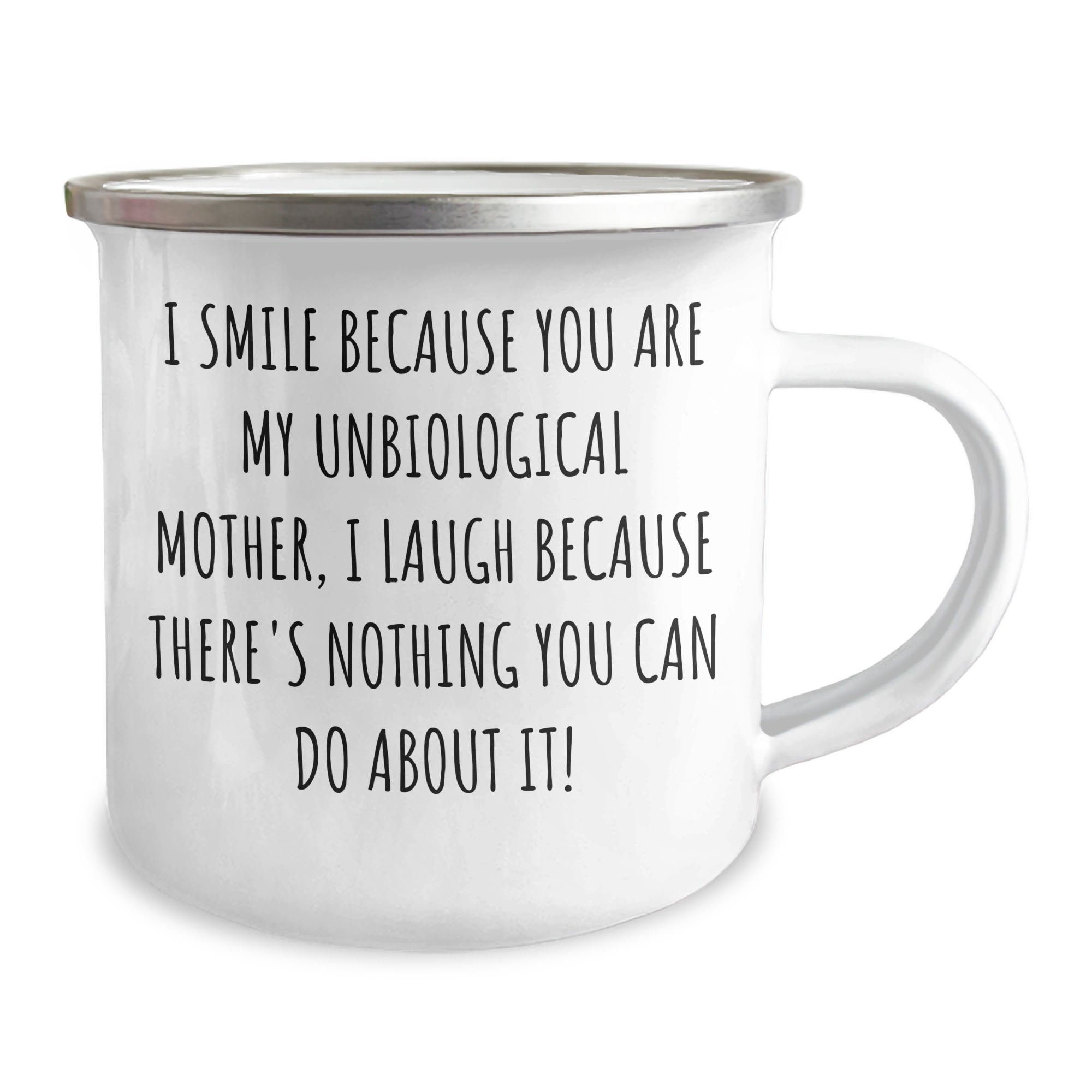 Are you looking for a unique gift for the unbiological mother in your life? Look no further! This hilarious camping mug is the perfect way to show your appreciation for her. With its funny quote 'I Smile Because You Are My Unbiological Mother, I Laugh Because There's Nothing You Can Do About It!' printed on it, this mug is sure to bring a smile to her face. Whether she's a coffee lover or a tea enthusiast, this mug is the perfect way to start her day.