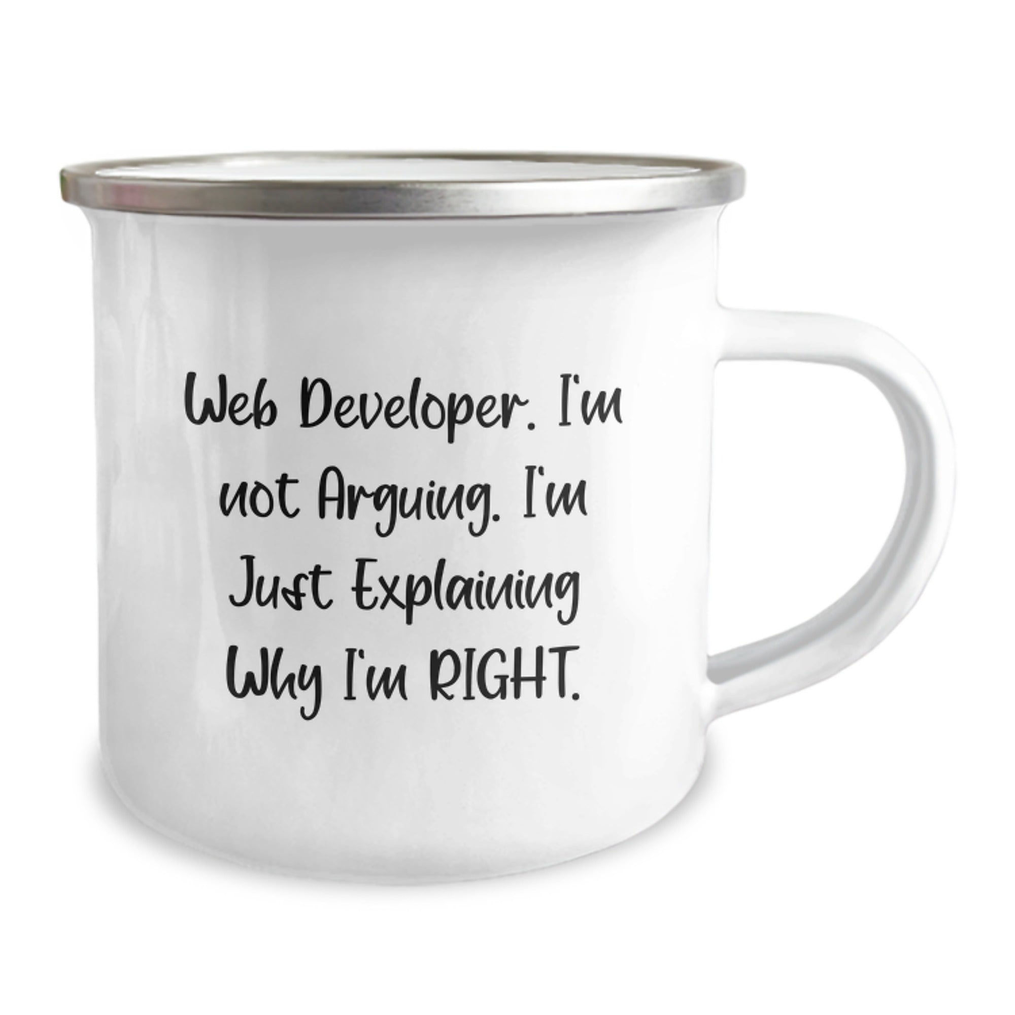 Are you a Web Developer or know someone who is? Do you want to show your appreciation for their hard work and dedication to coding? This Funny Web Developer Camping Mug is the ideal gift for any Web Developer on Valentine's. The quote 'I'm Not Arguing. I'm Just Explaining Why I'm Right.' is a hilarious and relatable phrase that any Web Developer will love. Made of stainless steel with an enamel finish, this camping mug is sturdy and long-lasting. It's the ideal gift for Web Developers who love to camp and enjoy a good cup of coffee or tea. Whether you're looking for a unique Valentine's gift or just a funny way to show your appreciation for your Web Developer friend, this camping mug is the perfect choice. It's a great way to show your love and appreciation for their hard work and dedication to coding. So why wait? Order this Funny Web Developer Camping Mug today and make your Web Developer friend's Valentine's a little brighter.