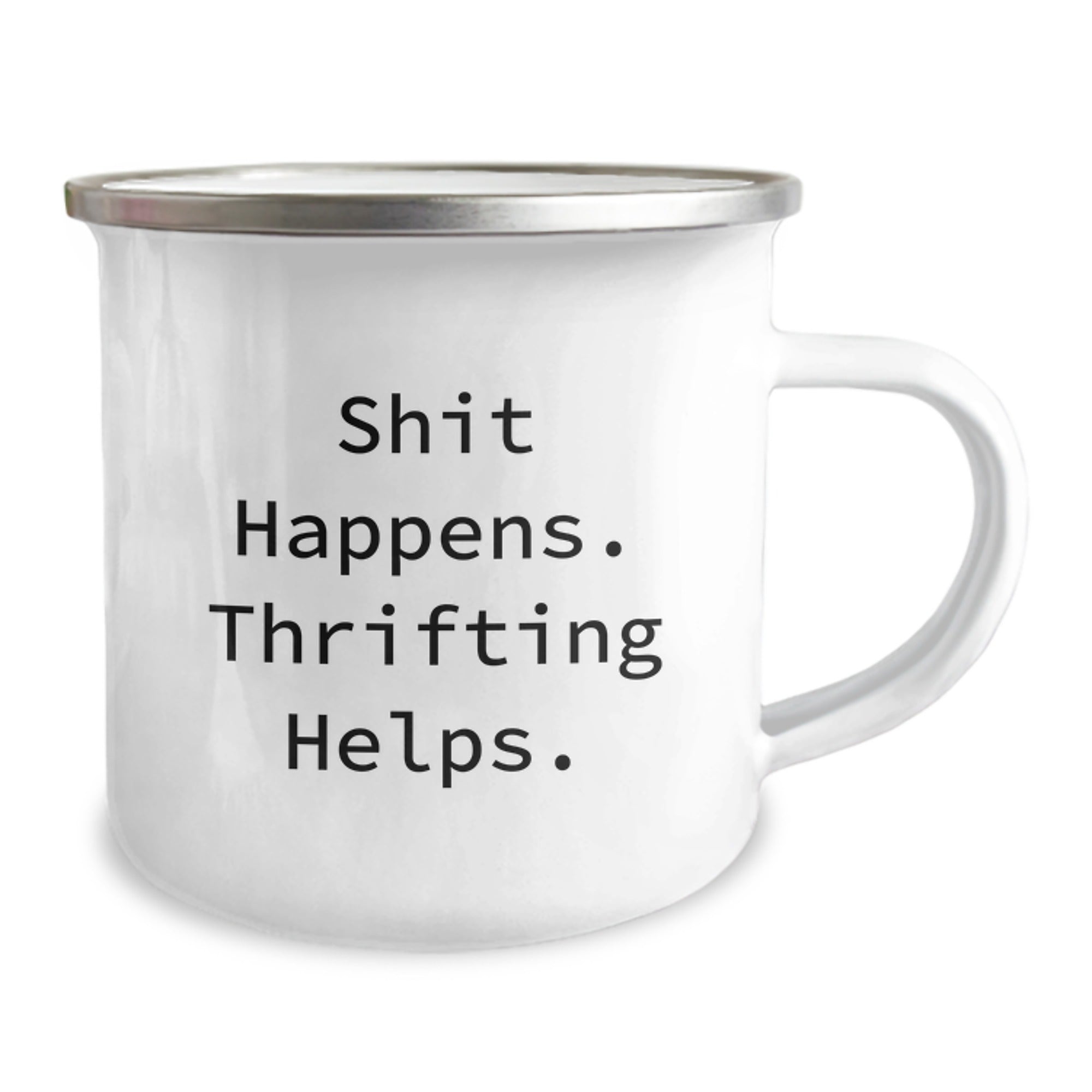 Our Thrifting Camping Mug features a bold and cheeky quote: Shit Happens. Thrifting Helps. It's the perfect way to add some humor and personality to your outdoor adventures or daily coffee routine.