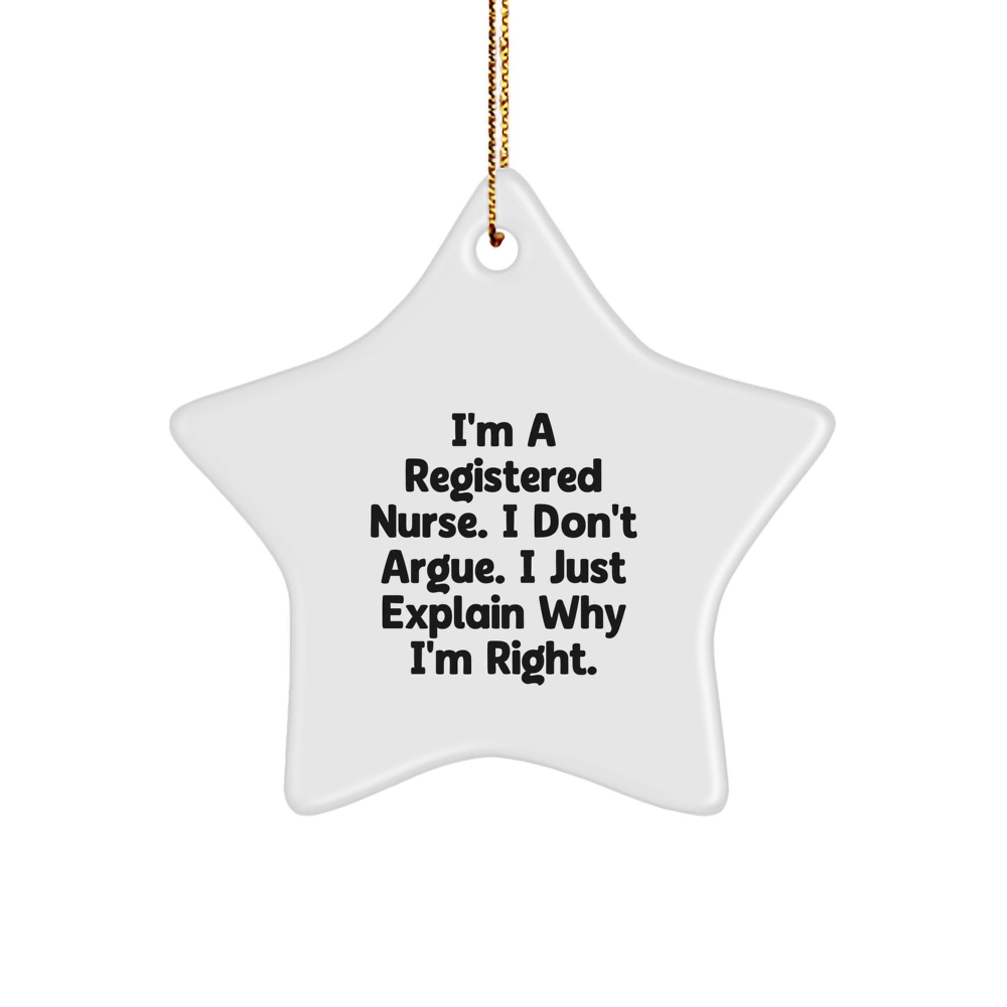 Or perhaps you're searching for the perfect present for a Registered Nurse in your life? Look no further! Our Registered Nurse Star Ornament is the perfect way to celebrate the holiday season and showcase your dedication to the medical field. The quote 'I'm A Registered Nurse. I Don't Argue. I Just Explain Why I'm Right' is a humorous take on the profession that is sure to bring a smile to the faces of fellow nurses and medical professionals.