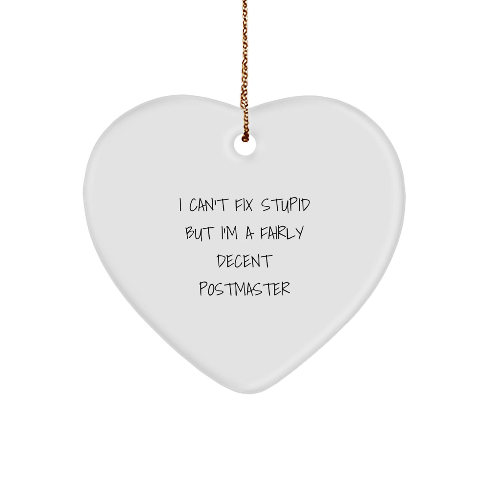Get a funny Postmaster gift for your favorite Postmaster with this heart-shaped ornament, perfect for Christmas. Made from sturdy MDF with a high-gloss plastic finish, this ornament is lightweight and resistant to breaking, making it a great choice for households with children or pets. The quote 'I Can't Fix Stupid But I'm A Fairly Decent Postmaster' is a hilarious way to acknowledge the Postmaster's hard work and dedication.
