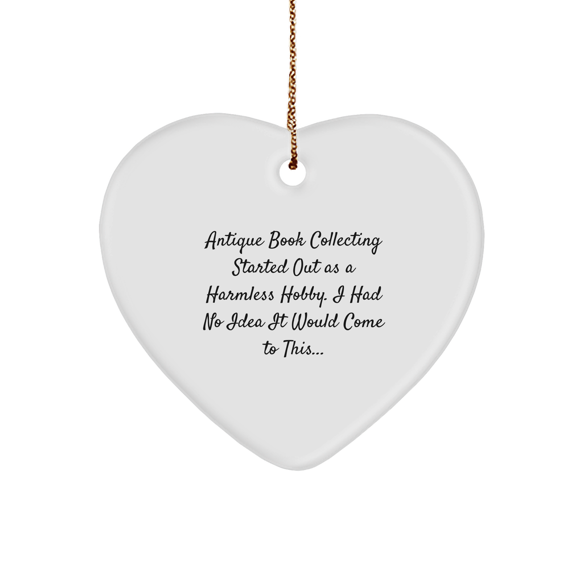 Experience the joy of antique book collecting with this unique Heart Ornament, perfect for any book lover. Savor every moment with the comfort of knowing your new favorite read is being cherished by an antique book enthusiast like you. 'Antique Book Collecting Started Out As A Harmless Hobby. I Had No Idea It Would Come To This...' says it all - this ornament is a must-have for any book collector.