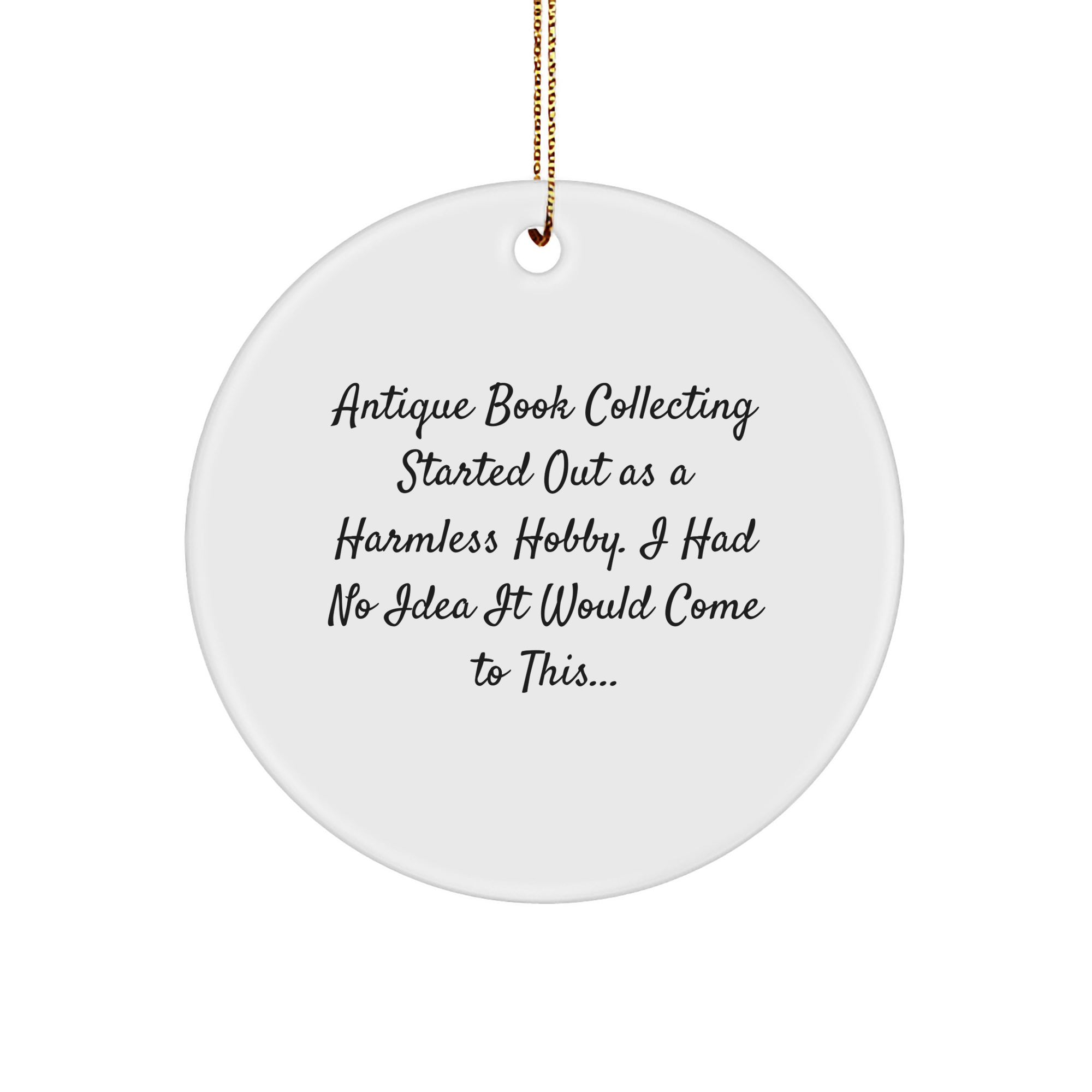 Make this Christmas season unforgettable for the 'Antique Book Collecting' enthusiast in your life with this thoughtful Circle Ornament gift, 'Antique Book Collecting started out as a harmless hobby, I had no idea it would come to this...' - a perfect reminder of the joy and passion that collecting brings.