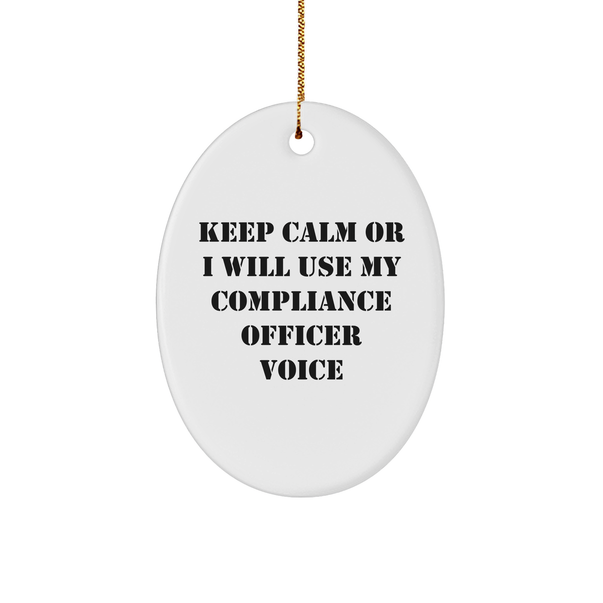 If you know a Compliance Officer who's always keeping it calm, then this unique Christmas gift is perfect for them. This oval ornament is vibrantly printed with the funny quote 'Keep Calm Or I Will Use My Compliance Officer Voice' on a white background, making it a great conversation starter. The Compliance Officer in your life will appreciate the humor and thoughtfulness behind this gift. This ornament is crafted from sturdy MDF with a high-gloss plastic finish, ensuring a long-lasting design. It's lightweight and resistant to breaking, making it a great choice for households with children or pets. The festive gold cord for easy hanging is the perfect touch. Give this Compliance Officer gift to your friend, coworker, or family member this Christmas and make their holiday season merry and bright.