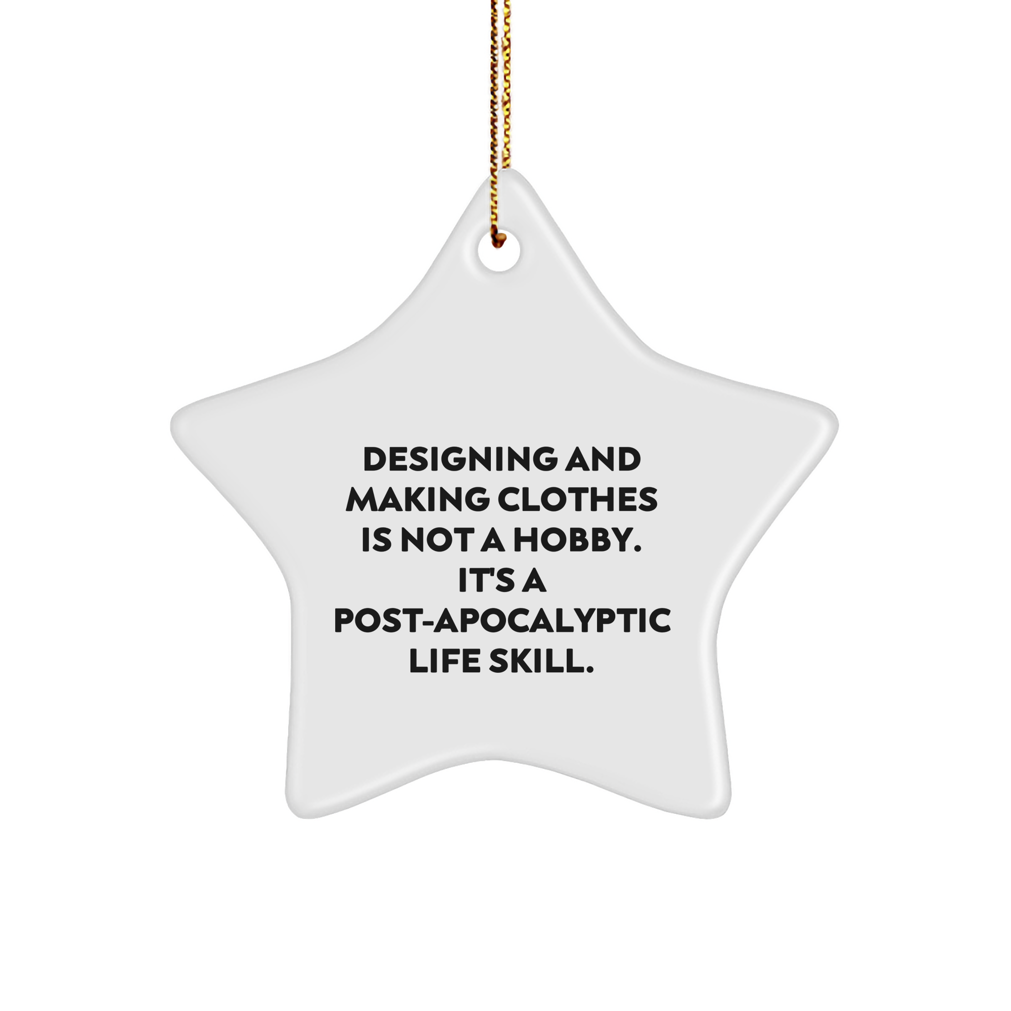 • Make a statement with our Designing and Making Clothes Star Ornament, featuring the entertaining quote: 'Designing And Making Clothes Is Not A Hobby. It's A Post-apocalyptic Life Skill.' Perfect for the Designing and Making Clothes enthusiast in your life.