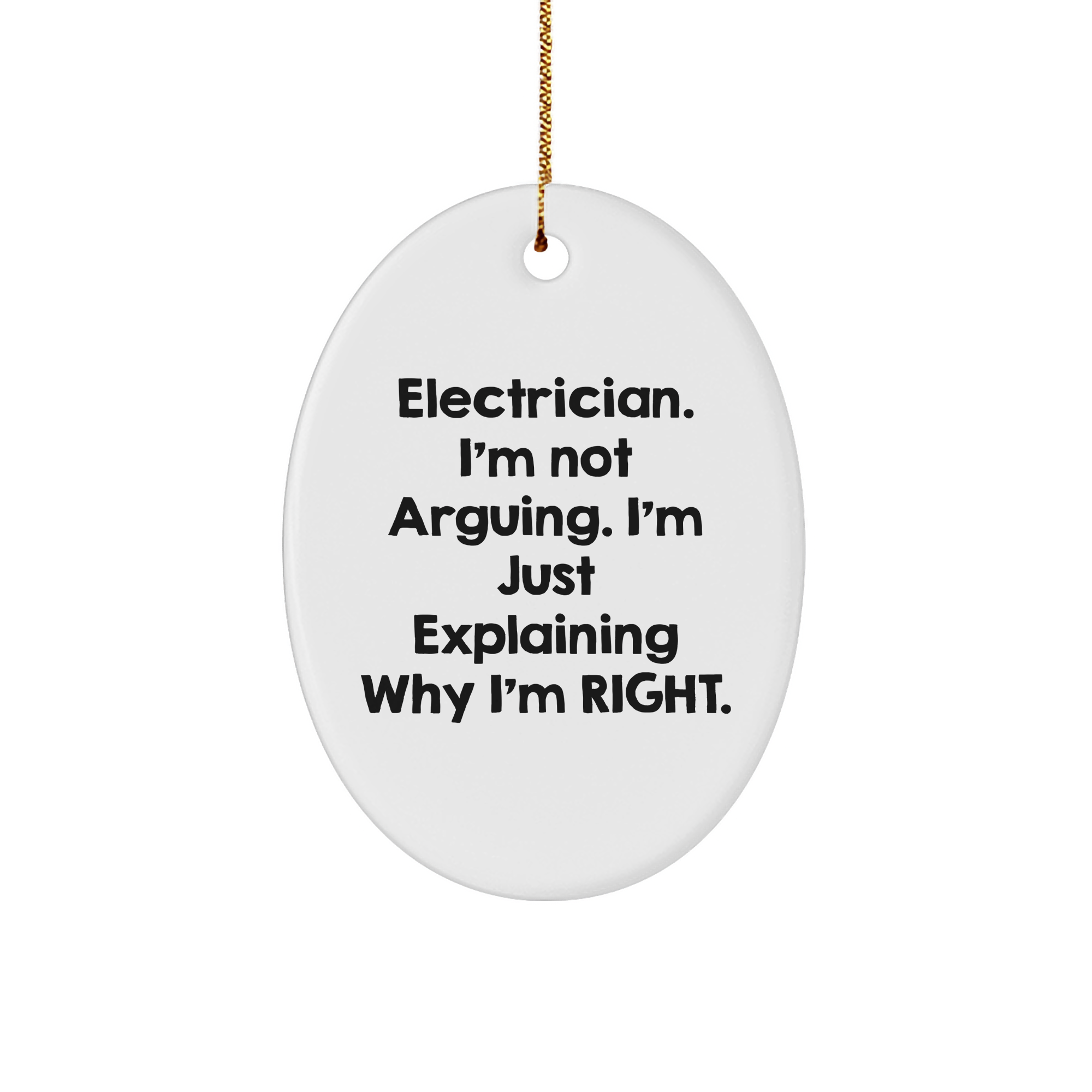 • Show your appreciation for the electrician in your life with our unique I'm Not Arguing. I'm Just Explaining Why I'm Right. Oval Ornament, featuring a glossy finish and gold-tone string for hanging.