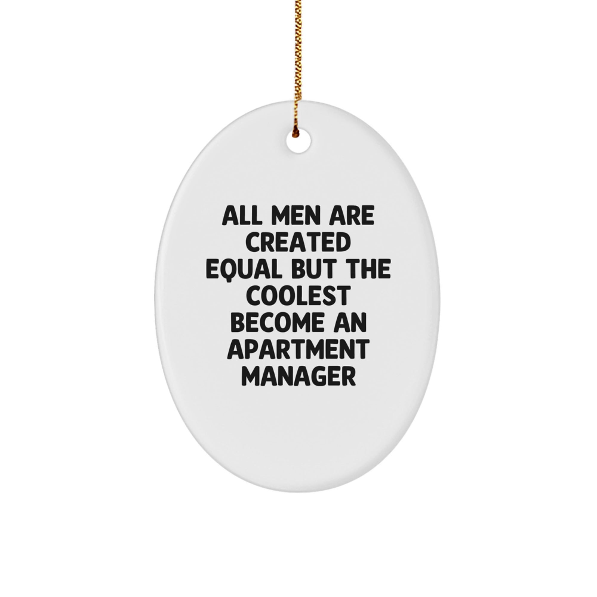 • Make a thoughtful and unique gift for your favorite Apartment Manager with this Oval Ornament. The quote 'All Men Are Created Equal But The Coolest Become An Apartment Manager' is a humorous and relatable phrase that any Apartment Manager would love.