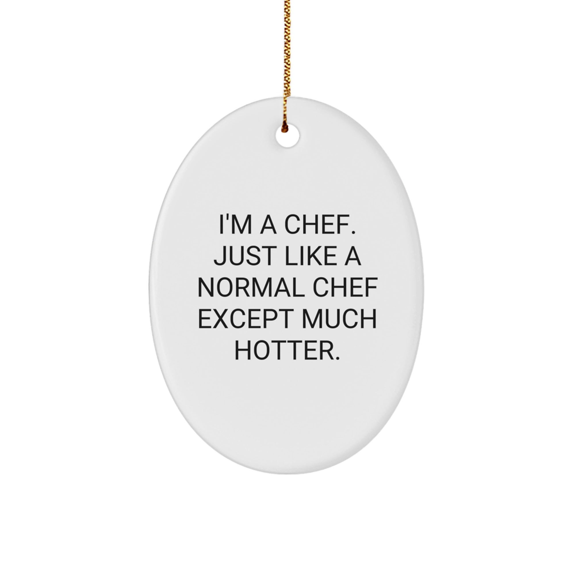 So don't wait any longer! Get your 'I'm A Chef. Just Like A Normal Chef Except Much Hotter.' Oval Ornament today and give the gift of cooking and laughter to your friends and family. Don't miss out and get ready to spice up your kitchen with a dash of humor!