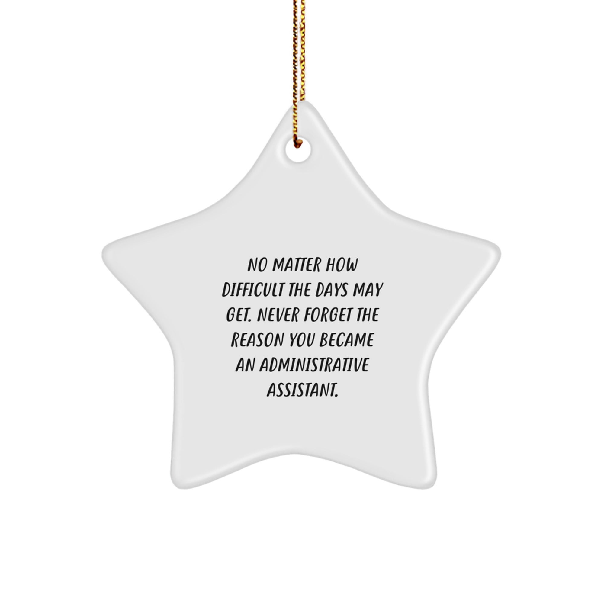 'No Matter How Difficult The Days May Get. Never Forget The Reason You Became An Administrative Assistant.' Celebrate your administrative assistant career with our beautiful Star Ornament, a thoughtful gift for any office buddy or coworker. Perfect for decorating your workspace or home office, this star-shaped ornament is a symbol of your dedication and hard work as an administrative assistant.