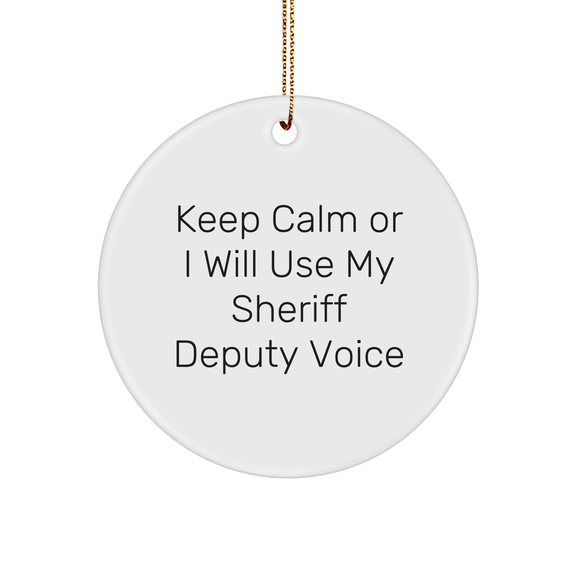 Are you a fan of the quote 'Keep Calm Or I Will Use My Sheriff Deputy Voice'? Do you know someone who is? This funny Sheriff Deputy Circle Ornament makes a great gift for any Sheriff Deputy enthusiast. Crafted from sturdy MDF with a high-gloss plastic finish, this ornament is lightweight and resistant to breaking, making it perfect for households with children or pets. The vibrant colors and festive gold cord add a touch of humor to any room. Whether you're looking for a unique gift for a friend, family member, or coworker, this Sheriff Deputy Ornament is sure to bring a smile to their face.