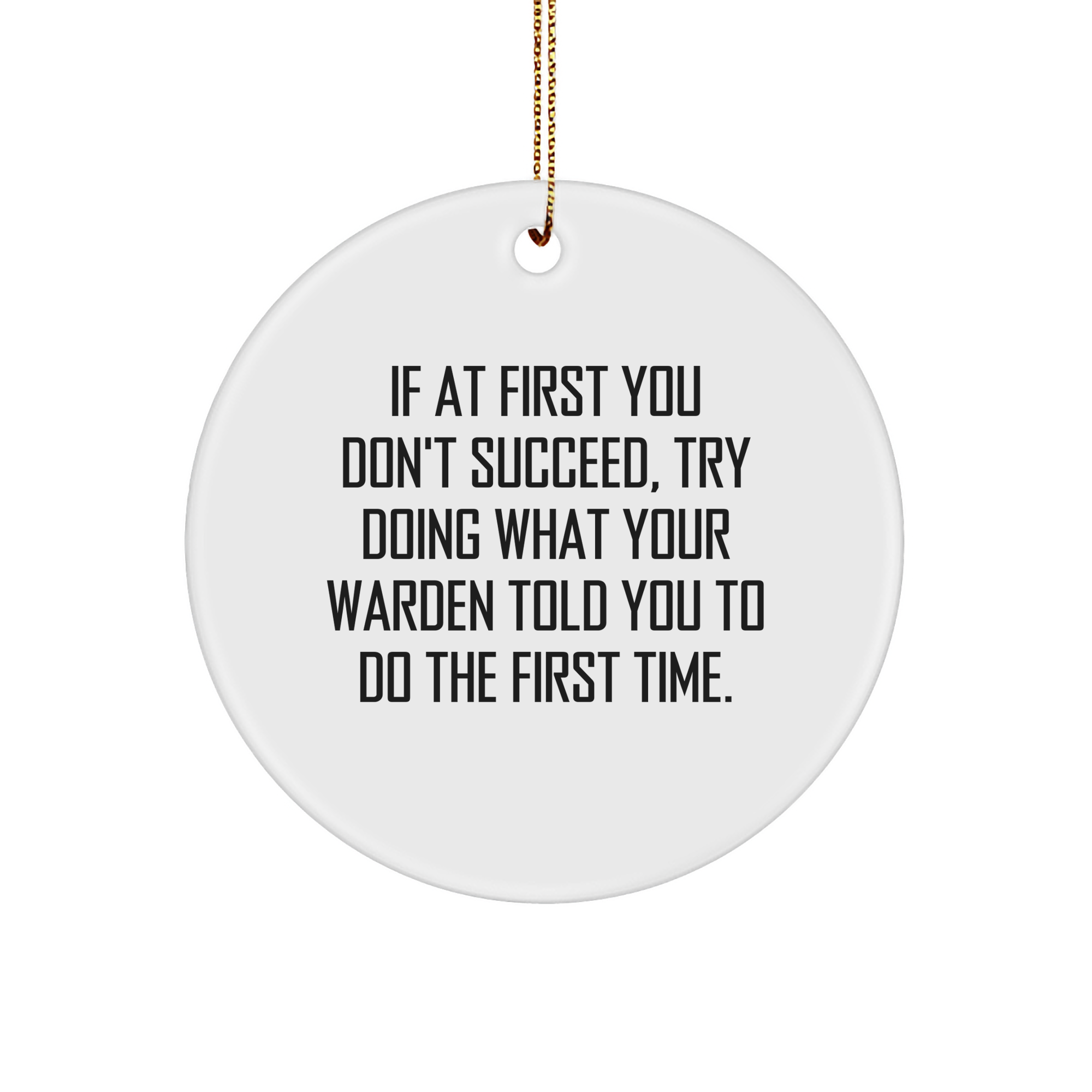The quote 'If At First You Don't Succeed, Try Doing What Your Warden Told You To Do The First Time.' is a humorous reminder that even the toughest tasks can be accomplished with a little perseverance. It's a great conversation starter and a thoughtful gift for anyone who loves a good laugh. Whether you're a Warden or just a fan, this ornament is sure to bring a smile to their face.